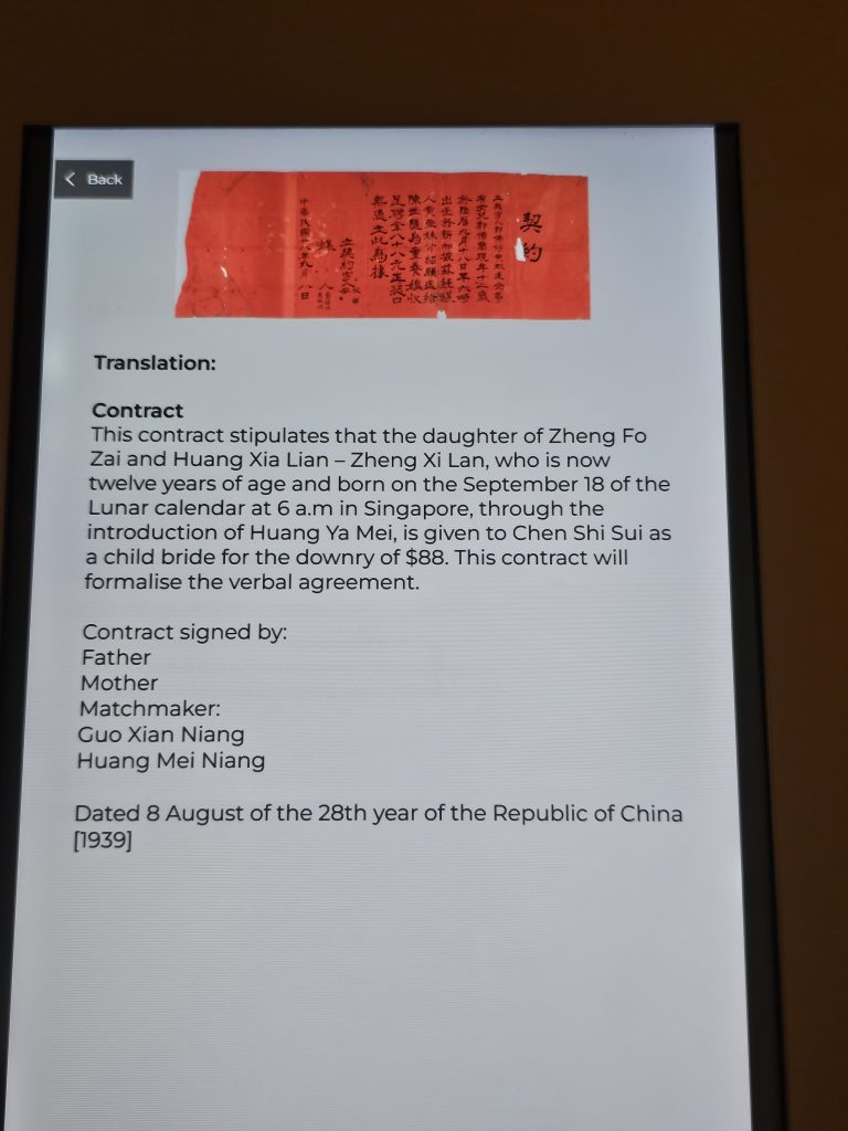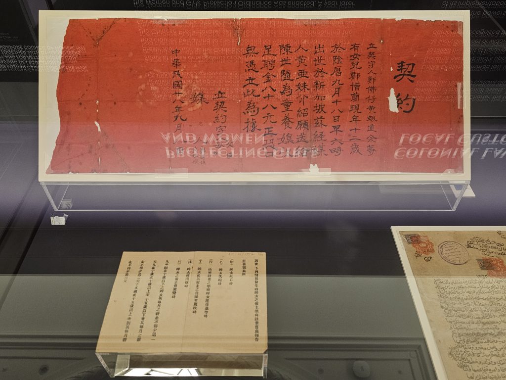 Women’s status during the late 19th century Singapore was unequal in practice, with women and girls often facing structural vulnerability in family arrangements and limited access to effective legal protection, which later reforms sought to remedy. One of the artefacts on display at the Exhibition shows a Chinese marriage contract dated 1939, which formalised the endowment of a 12-year-old girl as a child bride, facilitated by matchmakers and a specified dowry as “considerations”.