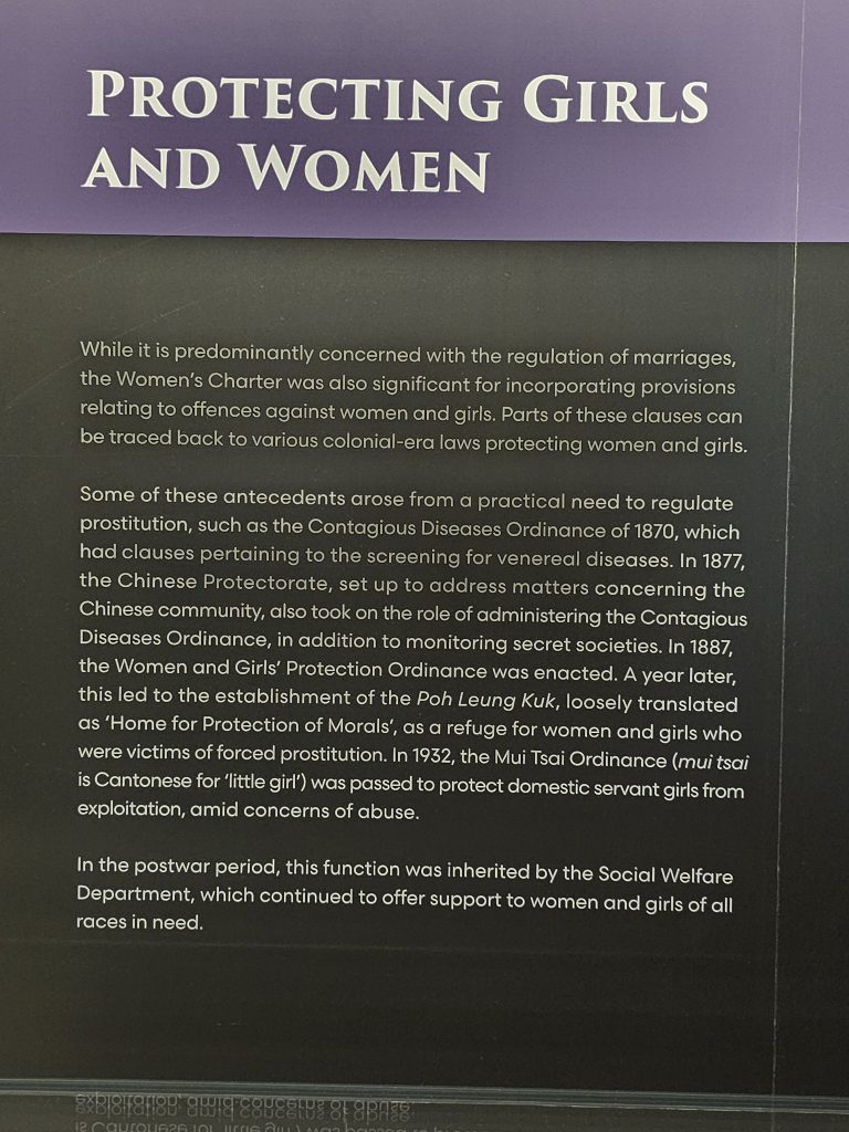 The Exhibition also traces the development of legal protection for women and girls through earlier legislations such as the Women and Girls’ Protection Ordinance 1887 and the Mui Tsai Ordinance 1932, which were enacted to address forced prostitution and exploitation of domestic servant girls. These historical realities provide important context for understanding the Women’s Charter 1961 as a remedial and protective statute aimed at strengthening equity and safeguarding vulnerable persons.